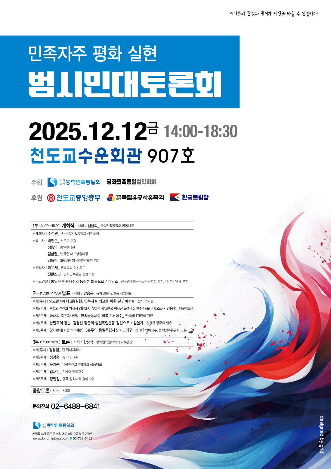 2. 저희 단체는 평화민족통일 원탁회의와 공동으로 오는 포덕 166(2025)년 12월 12일(금) 오후 2시, 천도교수운회관 907호에서 민족자주 평화실현 '범시민대토론회’를 개최합니다.