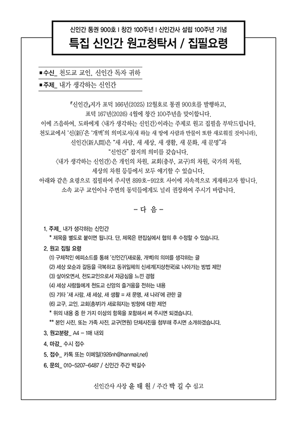 신인간은 한 사람의 잡지가 아니라 천도교 모두가 함께 쓰는 역사이자 기록입니다.